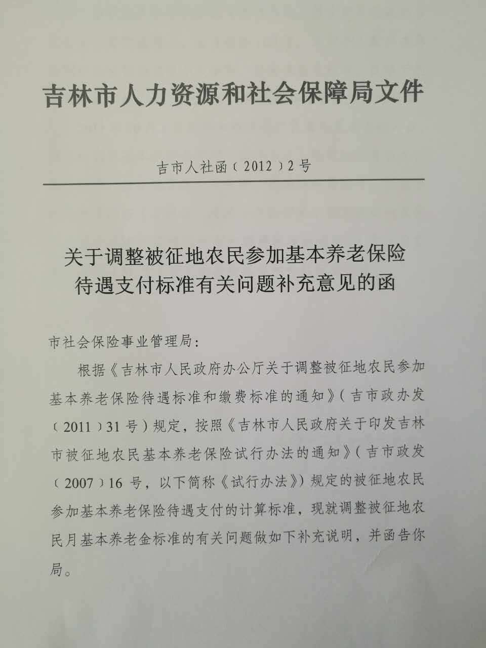 关于调整被征地农民参加基本养老保险待遇支付标准有关问题补充意见的函(吉市人社函【2012】2号)2